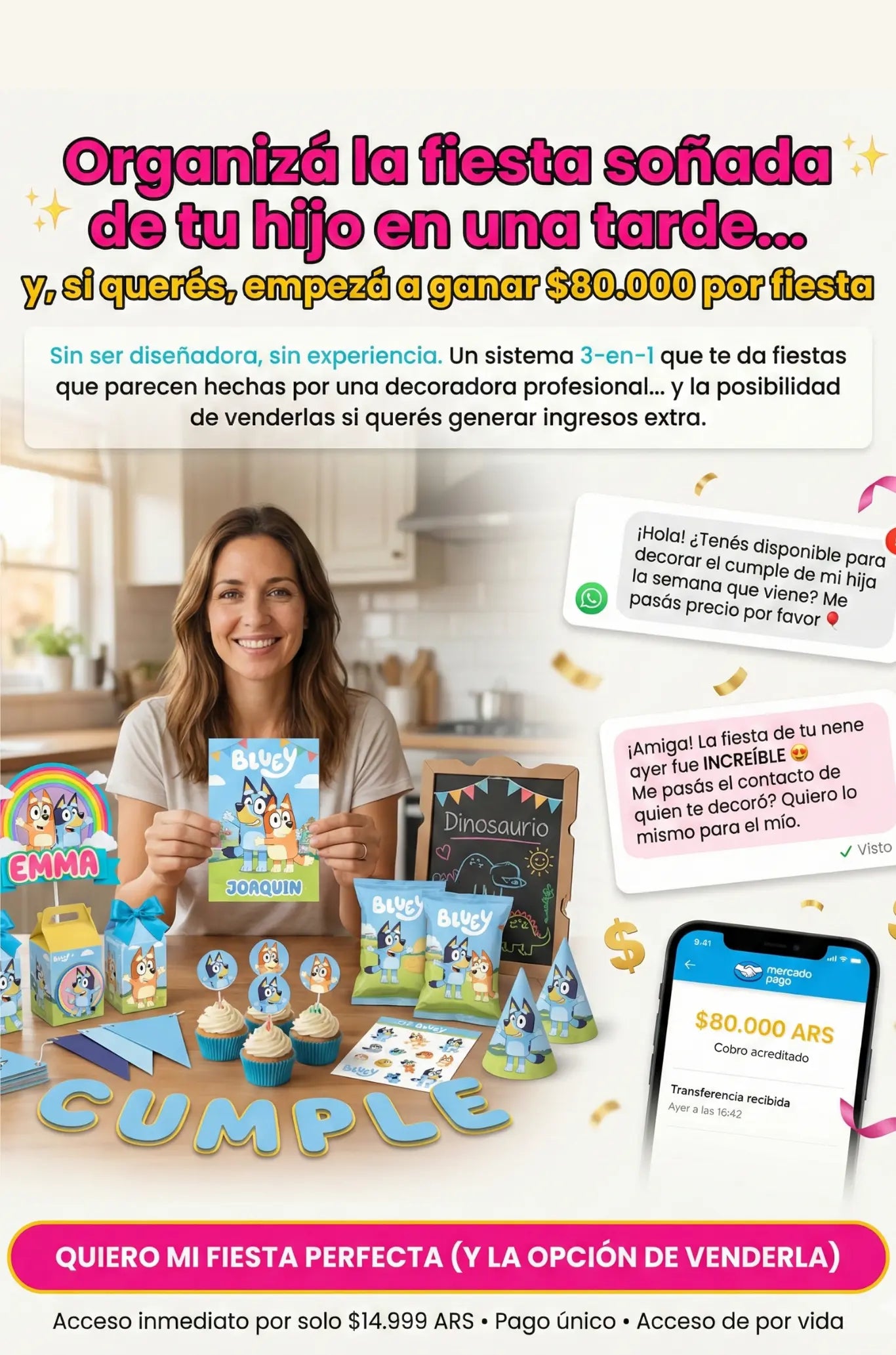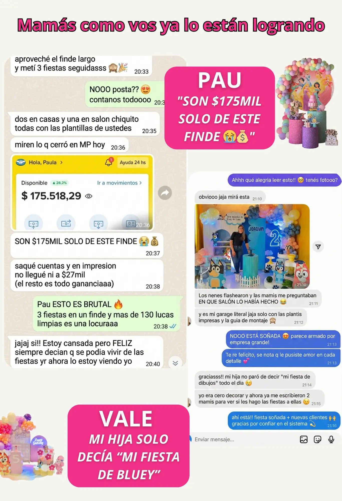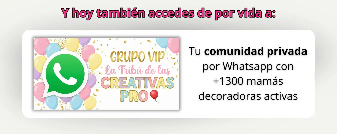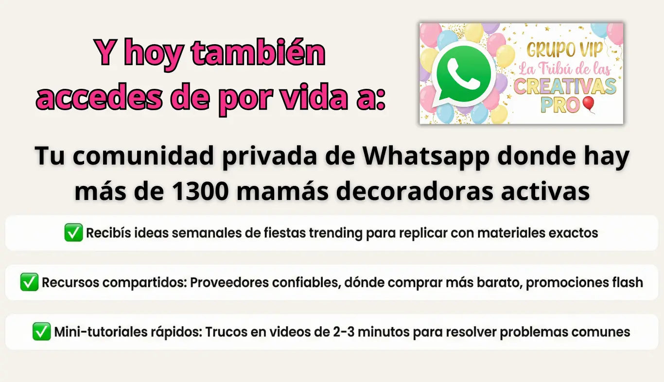Es tu comunidad privada por WhatsApp con más de 1300 mamás decoradoras activas. Recibís ideas semanales de fiestas trending, acceso a proveedores confiables, mini-tutoriales rápidos y respuestas inmediatas a todas tus dudas. El link de acceso te llega en tu email de compra al instante.