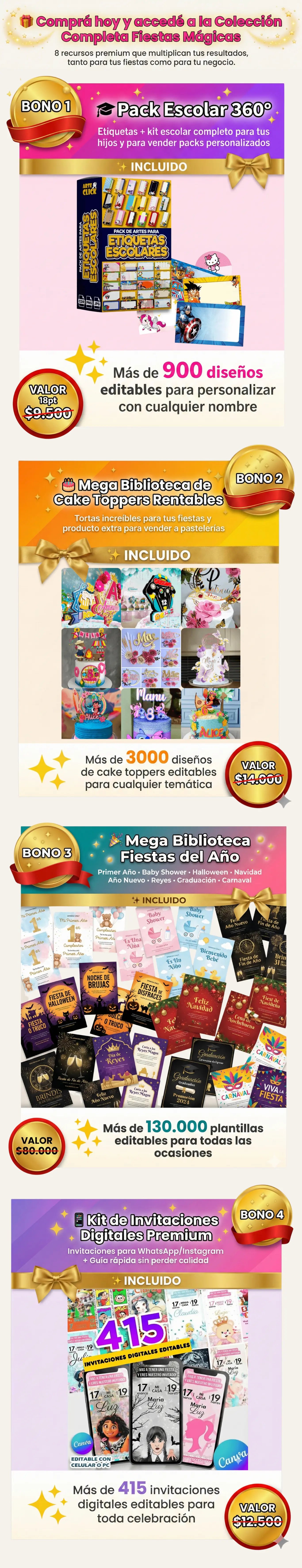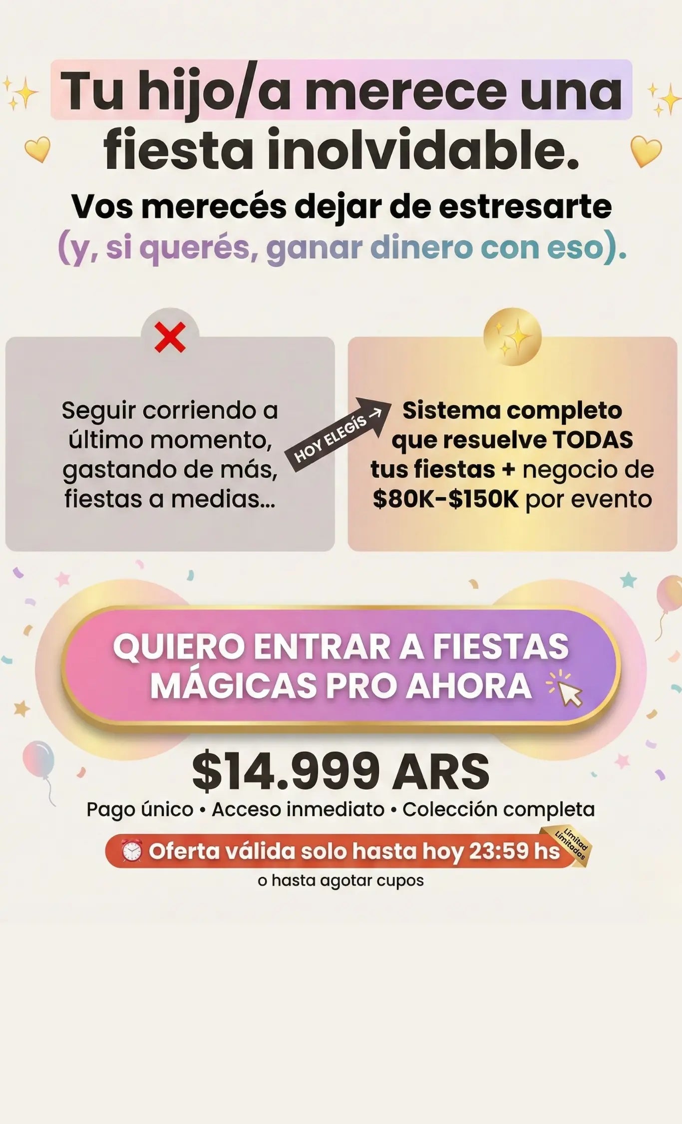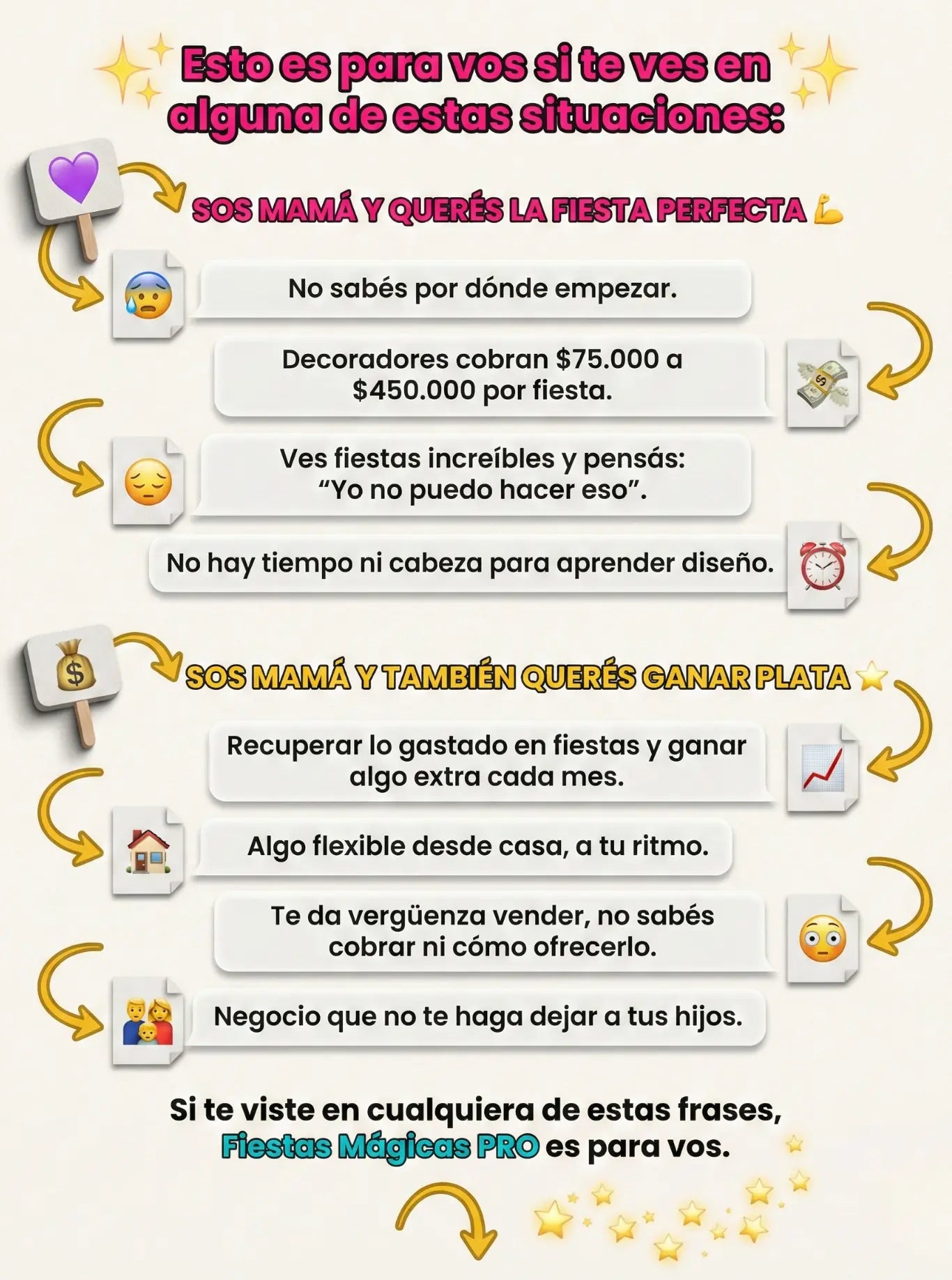 Es tu comunidad privada por WhatsApp con más de 1300 mamás decoradoras activas. Recibís ideas semanales de fiestas trending, acceso a proveedores confiables, mini-tutoriales rápidos y respuestas inmediatas a todas tus dudas. El link de acceso te llega en tu email de compra al instante.